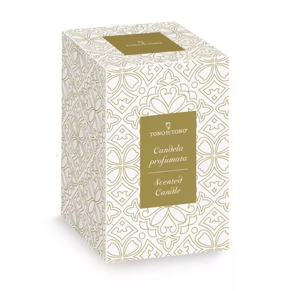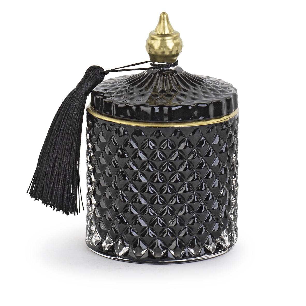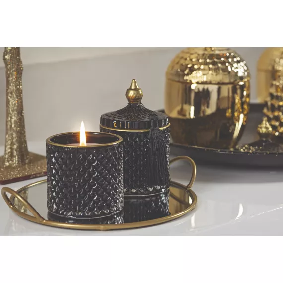 Elegante Candela Profumata Fragranza "Oceano" all'interno di un esclusivo Vasetto di Vetro Nero con Rifiniture Dorate e Coperchio e Nappina. Con Confezione Regalo. Dimensioni CM.8,5X14,5 H.