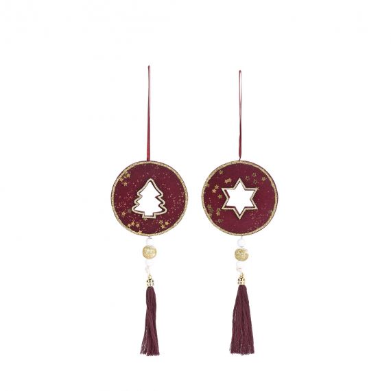 Confezione 2 decori tondi con nappe floccati - albero e stella