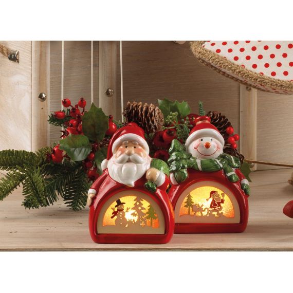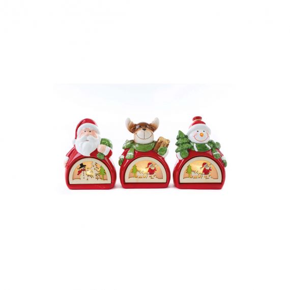 Confezione 3 soggetti natalizi in ceramica con led - santa/renna/pupazzo di neve
