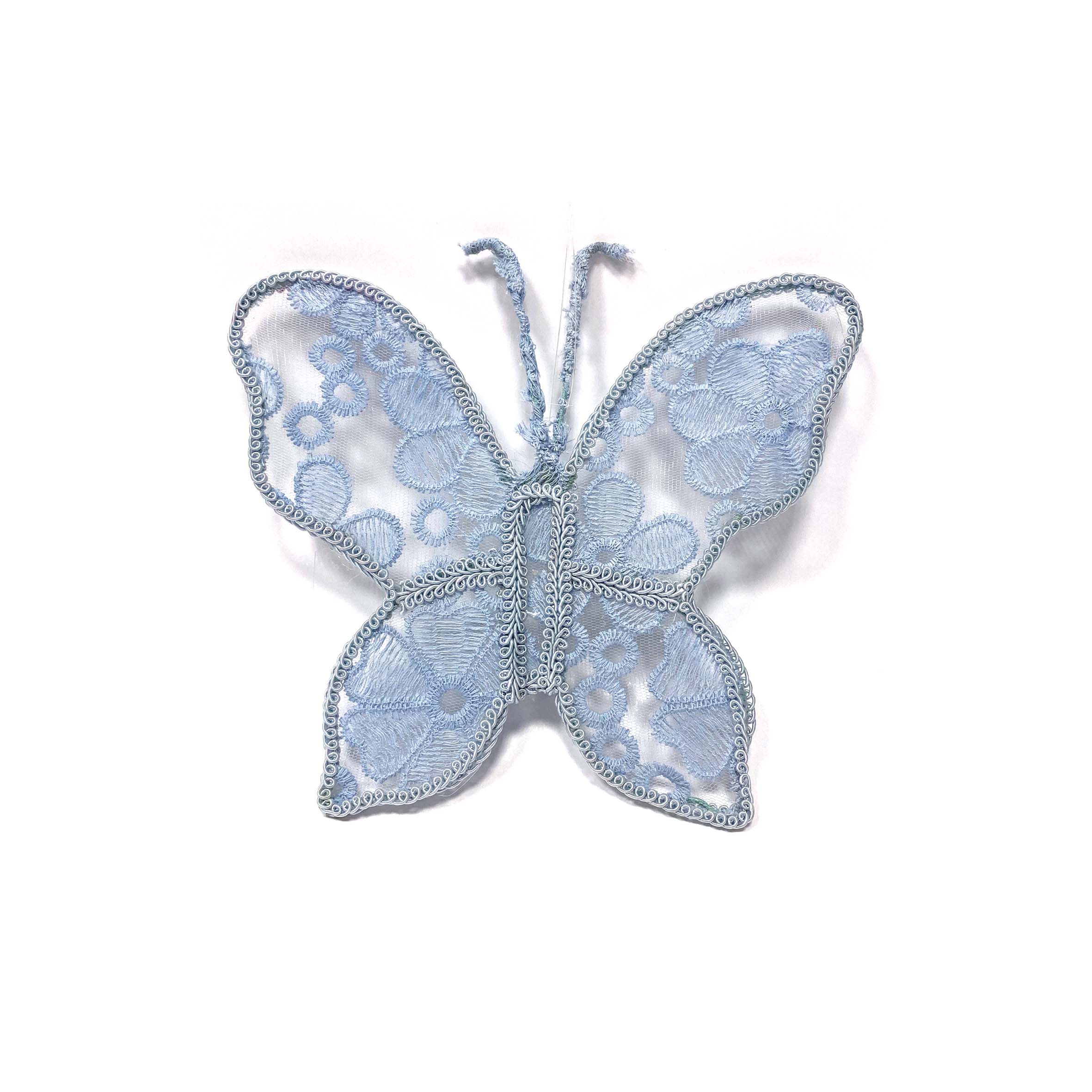 Bella e delicata farfalla decorativa appendibile in pizzo azzurro con passamaneria.