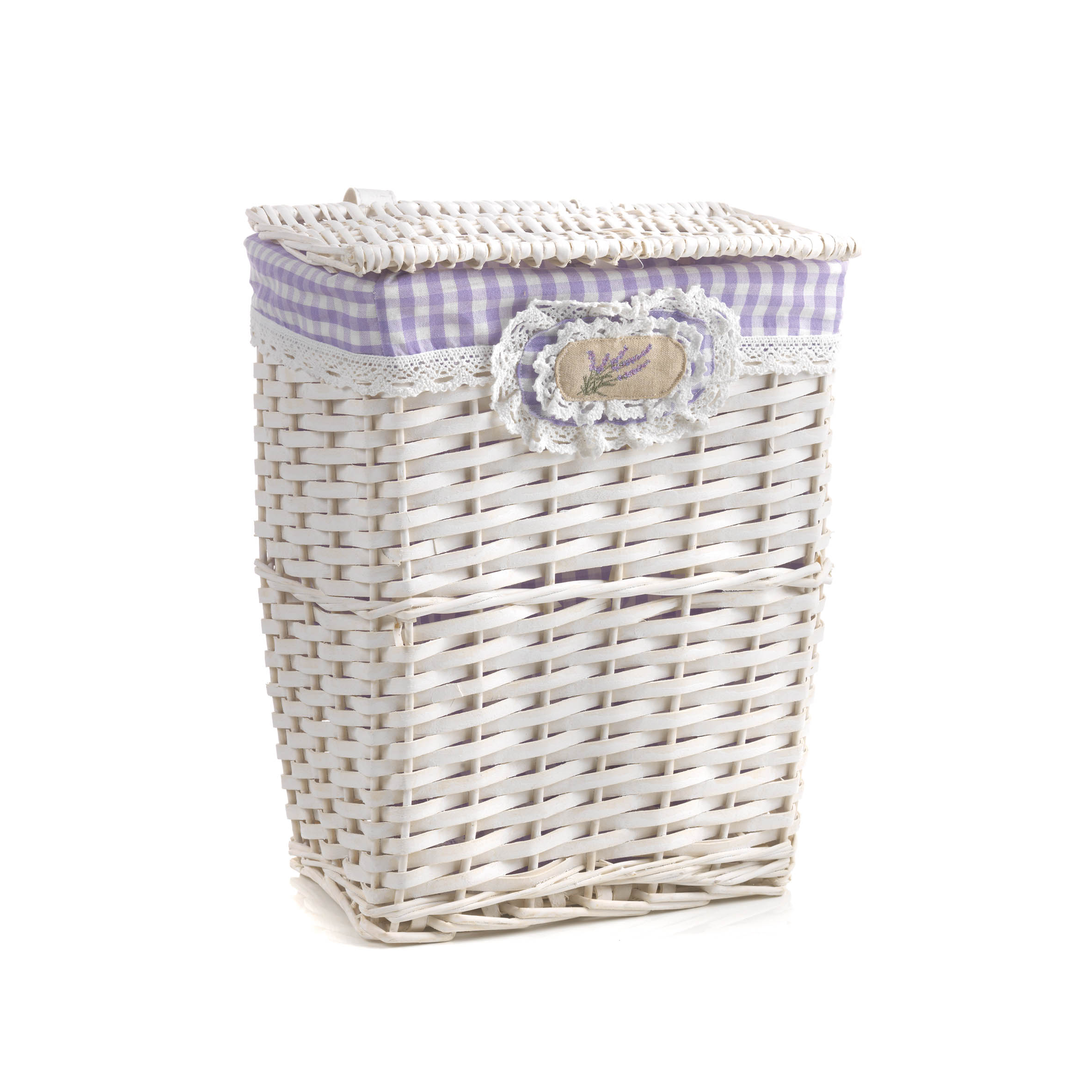 Cesto da bucato in vimini intrecciato in colore bianco con fodera in tessuto a quadretti bianchi e lilla, rimovibile e lavabile.