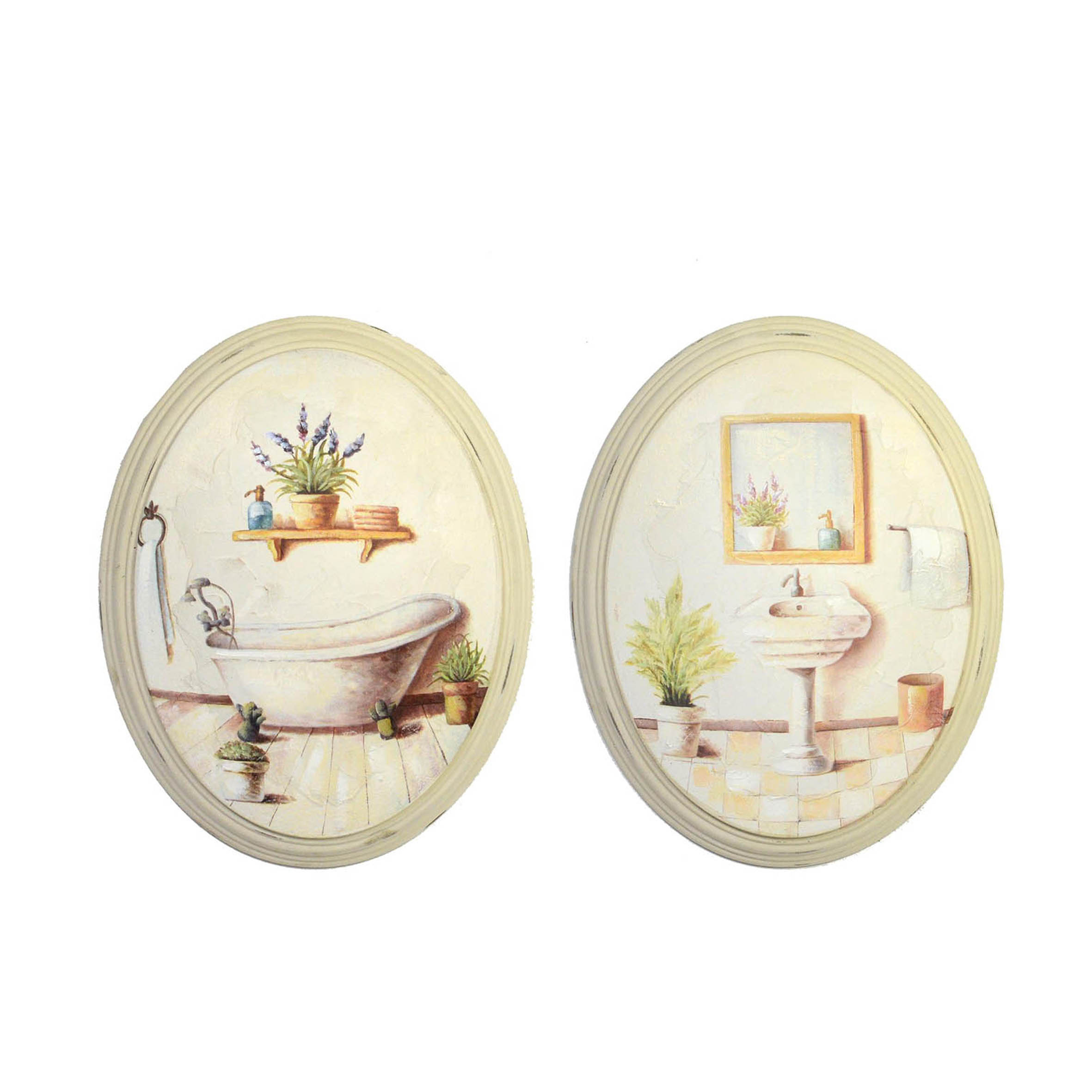 Quadretto ovale tema bagno, supporto in legno, con l’immagine di una sala da bagno vintage.