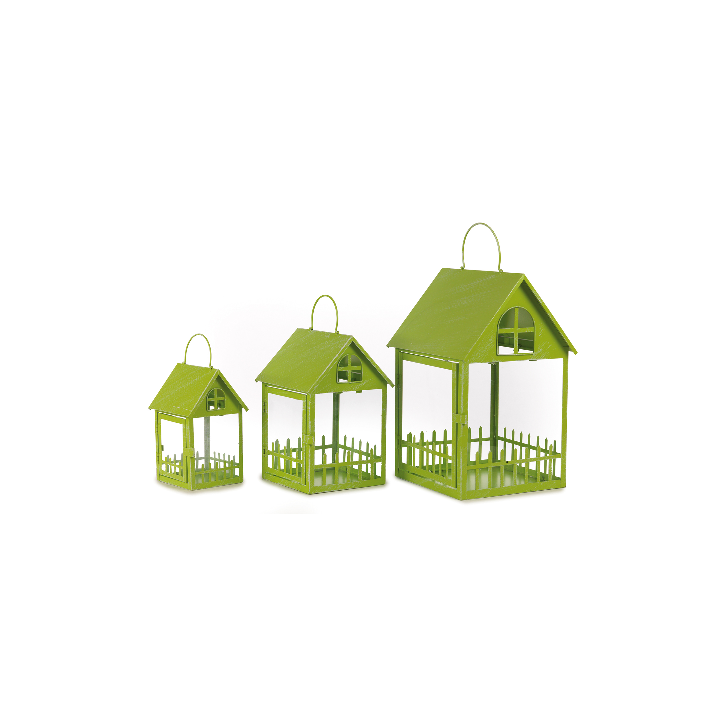 Il set di 3 lanterne in metallo di diverse dimensioni a forma di casette di Merlo Casa evoca una sensazione di grande intimità nelle tue stanze. Basta aggiungere i tealight e godersi la luce delle candele.