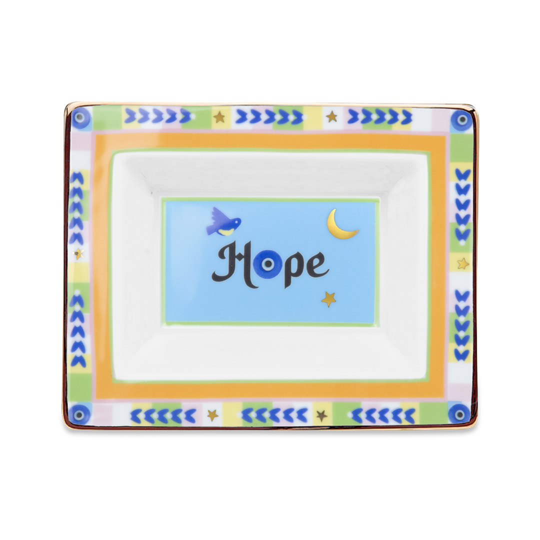 Grazioso svuotatasche rettangolare in porcellana della collezione “Mamma Mia” , con decori e colori vivaci e gioiosi.